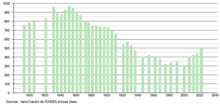 L'évolution du nombre d'habitants est connue à travers les recensements de la population effectués dans la commune depuis 1793. Pour les communes de moins de 10 000 habitants, une enquête de recensement portant sur toute la population est réalisée tous les cinq ans, les populations de référence des années intermédiaires étant quant à elles estimées par interpolation ou extrapolation[27]. Pour la commune, le premier recensement exhaustif entrant dans le cadre du nouveau dispositif a été réalisé en 2006[28].