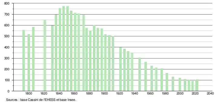 L'évolution du nombre d'habitants est connue à travers les recensements de la population effectués dans la commune depuis 1793. Pour les communes de moins de 10 000 habitants, une enquête de recensement portant sur toute la population est réalisée tous les cinq ans, les populations de référence des années intermédiaires étant quant à elles estimées par interpolation ou extrapolation[25]. Pour la commune, le premier recensement exhaustif entrant dans le cadre du nouveau dispositif a été réalisé en 2006[26].