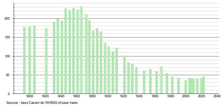 L'évolution du nombre d'habitants est connue à travers les recensements de la population effectués dans la commune depuis 1793. Pour les communes de moins de 10 000 habitants, une enquête de recensement portant sur toute la population est réalisée tous les cinq ans, les populations de référence des années intermédiaires étant quant à elles estimées par interpolation ou extrapolation[14]. Pour la commune, le premier recensement exhaustif entrant dans le cadre du nouveau dispositif a été réalisé en 2004[15].