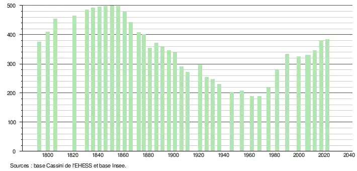 L'évolution du nombre d'habitants est connue à travers les recensements de la population effectués dans la commune depuis 1793. Pour les communes de moins de 10 000 habitants, une enquête de recensement portant sur toute la population est réalisée tous les cinq ans, les populations de référence des années intermédiaires étant quant à elles estimées par interpolation ou extrapolation[24]. Pour la commune, le premier recensement exhaustif entrant dans le cadre du nouveau dispositif a été réalisé en 2007[25].