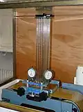 La première surface mobile est une plaque sur laquelle sont fixés des tubes gradués qui servent à mesurer la pression en certains points de la surface. Cette plaque peut s'incliner et s'éloigner par rapport à la suivante.