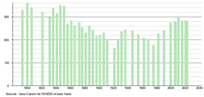 L'évolution du nombre d'habitants est connue à travers les recensements de la population effectués dans la commune depuis 1793. Pour les communes de moins de 10 000 habitants, une enquête de recensement portant sur toute la population est réalisée tous les cinq ans, les populations de référence des années intermédiaires étant quant à elles estimées par interpolation ou extrapolation[18]. Pour la commune, le premier recensement exhaustif entrant dans le cadre du nouveau dispositif a été réalisé en 2005[19].