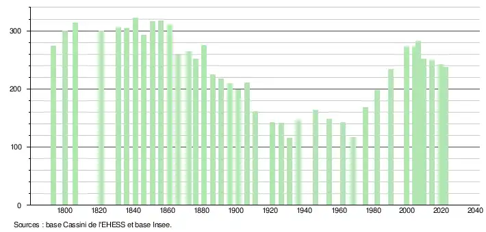 L'évolution du nombre d'habitants est connue à travers les recensements de la population effectués dans la commune depuis 1793. Pour les communes de moins de 10 000 habitants, une enquête de recensement portant sur toute la population est réalisée tous les cinq ans, les populations de référence des années intermédiaires étant quant à elles estimées par interpolation ou extrapolation[22]. Pour la commune, le premier recensement exhaustif entrant dans le cadre du nouveau dispositif a été réalisé en 2004[23].