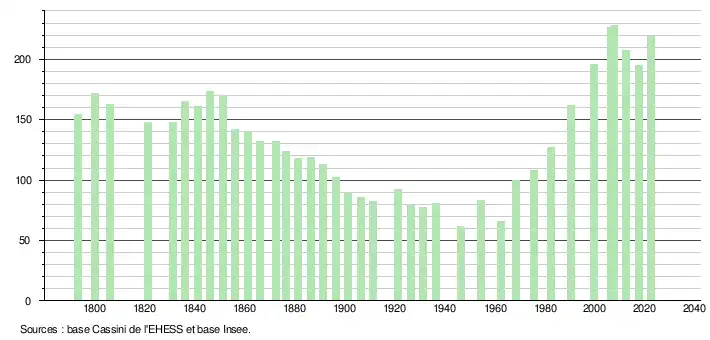 L'évolution du nombre d'habitants est connue à travers les recensements de la population effectués dans la commune depuis 1793. Pour les communes de moins de 10 000 habitants, une enquête de recensement portant sur toute la population est réalisée tous les cinq ans, les populations de référence des années intermédiaires étant quant à elles estimées par interpolation ou extrapolation[14]. Pour la commune, le premier recensement exhaustif entrant dans le cadre du nouveau dispositif a été réalisé en 2007[15].
