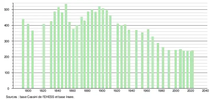 L'évolution du nombre d'habitants est connue à travers les recensements de la population effectués dans la commune depuis 1793. Pour les communes de moins de 10 000 habitants, une enquête de recensement portant sur toute la population est réalisée tous les cinq ans, les populations de référence des années intermédiaires étant quant à elles estimées par interpolation ou extrapolation[31]. Pour la commune, le premier recensement exhaustif entrant dans le cadre du nouveau dispositif a été réalisé en 2005[32].