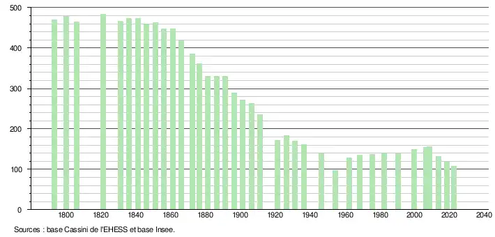 L'évolution du nombre d'habitants est connue à travers les recensements de la population effectués dans la commune depuis 1793. Pour les communes de moins de 10 000 habitants, une enquête de recensement portant sur toute la population est réalisée tous les cinq ans, les populations de référence des années intermédiaires étant quant à elles estimées par interpolation ou extrapolation[13]. Pour la commune, le premier recensement exhaustif entrant dans le cadre du nouveau dispositif a été réalisé en 2008[14].