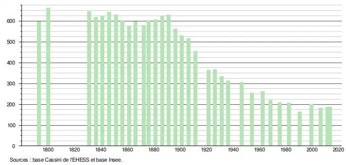 - ↑ Par convention dans Wikipédia, le principe a été retenu de n’afficher dans le tableau des recensements et le graphique, pour les populations légales postérieures à 1999, que les populations correspondant à une enquête exhaustive de recensement pour les communes de moins de 10 000 habitants, et que les populations des années 2006, 2011, 2016, etc. pour les communes de plus de 10 000 habitants, ainsi que la dernière population légale publiée par l’Insee pour l'ensemble des communes.