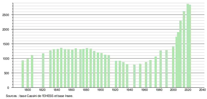L'évolution du nombre d'habitants est connue à travers les recensements de la population effectués dans la commune depuis 1793. Pour les communes de moins de 10 000 habitants, une enquête de recensement portant sur toute la population est réalisée tous les cinq ans, les populations de référence des années intermédiaires étant quant à elles estimées par interpolation ou extrapolation[38]. Pour la commune, le premier recensement exhaustif entrant dans le cadre du nouveau dispositif a été réalisé en 2004[39].
