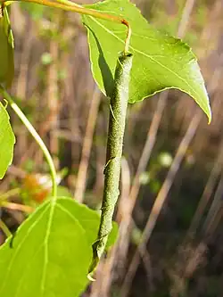 La femelle pond des œufs blancs (peu nombreux : 1 à 4)[1] dans des feuilles de peupliers (tremble, Populus tremula et peuplier blanc, Populus alba) qu'elle a préalablement roulées en forme de mince cigare au prix d'un long travail avec parfois l'aide d'un mâle.