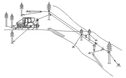 - Le câble-mât sur le camion : d'habitude il s'agit de machines très efficaces, le temps de montage et de démontage sont assez bas, grand productivité de travail. Inconvénient : besoin de desserte forestière et prix d'achat assez élevé.