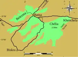 La cédraie du Chélia se situe dans le plus haut sommet de l'Aurès (à 2 328 m d'altitude) au sud-est de la ville de Batna, les forêts commencent de la commune de Chélia[13] jusqu'à Moussa-El-Ayati, encerclent Ain Mimoun, en passent sur djebel Faraoun et finissent aux abords de Chentgouma[14], sur une superficie totale de 7 000 ha avec des précipitations annuelles de 700 à 790 mm[11]. Les arbres qui se situent au sud du djebel Chélia au lieu-dit Oued Tidder à une altitude moyenne de 1 860 m, ont un diamètre moyen qui avoisine les 80 cm avec une hauteur moyenne de plus de 30 m âgés jusqu’à 150 ans[15].