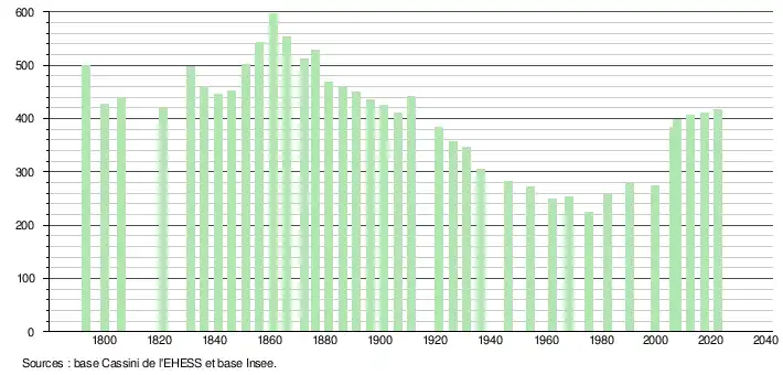 L'évolution du nombre d'habitants est connue à travers les recensements de la population effectués dans la commune depuis 1793. Pour les communes de moins de 10 000 habitants, une enquête de recensement portant sur toute la population est réalisée tous les cinq ans, les populations de référence des années intermédiaires étant quant à elles estimées par interpolation ou extrapolation[24]. Pour la commune, le premier recensement exhaustif entrant dans le cadre du nouveau dispositif a été réalisé en 2007[25].