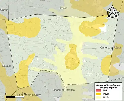 Le retrait-gonflement des sols argileux est susceptible d'engendrer des dommages importants aux bâtiments en cas d’alternance de périodes de sécheresse et de pluie. 25,2 % de la superficie communale est en aléa moyen ou fort (19,2 % au niveau départemental et 48,5 % au niveau national). Sur les 192 bâtiments dénombrés sur la commune en 2019, 48 sont en aléa moyen ou fort, soit 25 %, à comparer aux 17 % au niveau départemental et 54 % au niveau national. Une cartographie de l'exposition du territoire national au retrait gonflement des sols argileux est disponible sur le site du BRGM[20],[Carte 2].