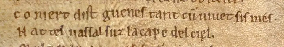 C’est cette dernière notation qui est utilisée en français dès le premier manuscrit littéraire[2] en langue française, la Cantilène de sainte Eulalie (datant de 881 et comportant 29 vers), et ceci une seule fois, au vers 21 :