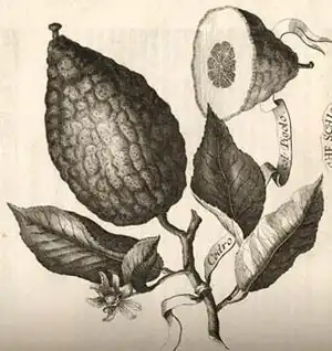 cédratier de Salo, cedro di Roma[83], chidrato di Salò ou di Garda ou del lago (Citrus medica salodiana, Citrum salodianum parvum Ferr.), pulpe savoureuse selon Risso, plus rustique que le cédrat de Florence il poussait à Nice[84], Gallésio écrit «est recherché pour l'arome de l'écorce extérieure, et pour la délicatesse de l'écorce intérieure. Il parait originaire de Salò sur le lac de Garda, où sa culture est très étendue; on en cultive aussi à Nervi, à Pegi, à Final, où on l'appelle cedrino»[85]. Risso décrit un fruit différent sous le nom de Cédrat de Rome dont il tire un exemplaire de l'orangerie de Versailles. Le fruit est profondément mamelonné à son sommet[86].