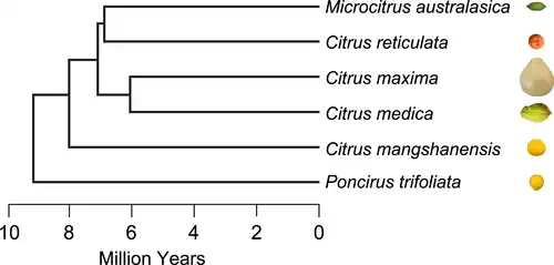 La phylogénie des agrumes chez Li He et al. (2020) le cédrat est une des 6 populations ancestrales, la dernière apparue avec C. maxima[11].
