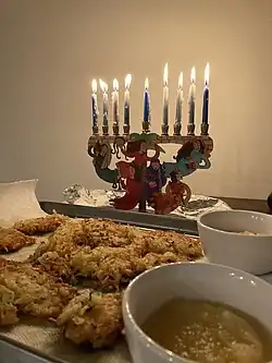 Hanoucca, fête de louange et de reconnaissance, célèbre le miracle de la fiole d’huile, selon lequel une petite flasque suffit à alimenter le candélabre du Temple pendant huit jours alors que la quantité suffisait pour un jour à peine. Dès lors, un chandelier à huit branches est allumé à la fenêtre principale des maisons juives, chaque nuit pour « publier le miracle » et le Hallel est déclamé pendant huit jours après qu’une courte action de grâce a été insérée dans la prière[49].