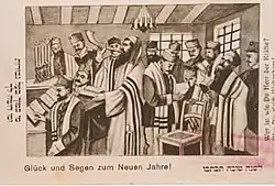 Roch Hachana, le nouvel an juif, est un jour de jugement précédé d’une période pénitentielle commençant au mois d’eloul au cours de laquelle les séfarades récitent des poèmes pénitentiels (les ashkénazes ne commencent qu’à la semaine précédant Roch Hachana). Célébré pendant deux jours, en terre d’Israël comme en diaspora, il est marqué par la sonnerie du chofar et diverses cérémonies propitiatoires comme le tashlikh, renvoi symbolique des péchés aux tréfonds d’un point d’eau. Cependant, la fête n’est pas totalement dépourvue de joie, les Juifs affirmant leur confiance en Dieu en se parant de leurs plus beaux atours et en prenant des repas où, à l’image du pain ou de la pomme trempés dans le miel, la douceur prédomine[43]. D’autres aliments de bon augure sont consommés parmi lesquels le sésame ou les épinards[44], à l’origine de la pkaïla tunisienne. Les dix jours entre Roch Hachana et Yom Kippour sont une période d’introspection et de réconciliation avec autrui. Certaines communautés observent également la coutume des kapparot, « offrant » un coq (ou une poule) en victime expiatoire par substitution[45].