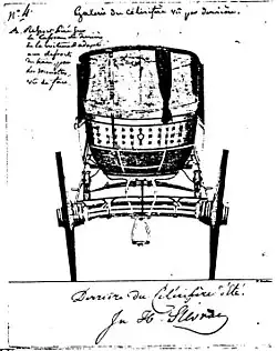 Sur ces plans dessinés bien après son existence supposée, le célérifère présente beaucoup de similitudes avec la draisienne[10]. C'est également une « machine à courir » en bois, sans pédales et sans freins, dotée de deux roues, mais qui en revanche ne permet pas de faire pivoter la roue avant, donc sans direction, ce qui la rend quasiment inutilisable[11]. Les musées nationaux, ne possédant pas cette machine, puisqu’elle n’avait jamais existé, en fabriquèrent, d'après les plans conçus par Louis Baudry de Saunier, des « copies », qui sont encore exposées de nos jours.