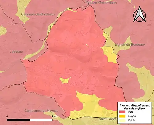Le retrait-gonflement des sols argileux est susceptible d'engendrer des dommages importants aux bâtiments en cas d’alternance de périodes de sécheresse et de pluie. La totalité de la commune est en aléa moyen ou fort (67,4 % au niveau départemental et 48,5 % au niveau national). Sur les 807 bâtiments dénombrés sur la commune en 2019, 807 sont en aléa moyen ou fort, soit 100 %, à comparer aux 84 % au niveau départemental et 54 % au niveau national. Une cartographie de l'exposition du territoire national au retrait gonflement des sols argileux est disponible sur le site du BRGM[23],[Carte 2].