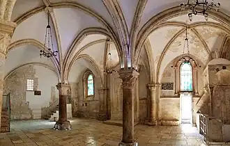 En 1335, les Franciscains firent l'acquisition du bâtiment du Cénacle et le restaurèrent, avec une voûte gothique. Au XIVe siècle, ils eurent à subir une certaine pression en vue de leur expulsion[6]. Finalement, en 1523, les Franciscains furent chassés du bâtiment et la Chambre haute fut convertie en mosquée ; quant à la chambre basse du rez-de-chaussée, qui contient un cénotaphe de David d'après une tradition du XIIe siècle, elle est maintenant transformée en synagogue.