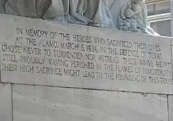 L'inscription sur la base du monument est : Erected in Memory of the Heroes who sacrificed their lives at the Alamo, March 6, 1836 in the defense of Texas, 'They chose never to surrender nor retreat, these brave hearts with flag still proudly waving perished in the flames of immortality that their high sacrifice might lead to the founding on this Texas. ( Érigés en mémoire des héros qui ont sacrifié leur vie à Alamo, le 6 mars 1836 pour la défense du Texas, `` Ils ont choisi de ne jamais se rendre ni se retirer, ces braves cœurs au drapeau toujours fièrement agitant périt dans les flammes de l'immortalité pour que leur grand sacrifice puisse conduire à la fondation de ce Texas) .
