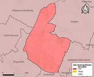 Le retrait-gonflement des sols argileux est susceptible d'engendrer des dommages importants aux bâtiments en cas d’alternance de périodes de sécheresse et de pluie. La totalité de la commune est en aléa moyen ou fort (88,8 % au niveau départemental et 48,5 % au niveau national). Sur les 536 bâtiments dénombrés sur la commune en 2019, 536 sont en aléa moyen ou fort, soit 100 %, à comparer aux 98 % au niveau départemental et 54 % au niveau national. Une cartographie de l'exposition du territoire national au retrait gonflement des sols argileux est disponible sur le site du BRGM[24],[Carte 3].