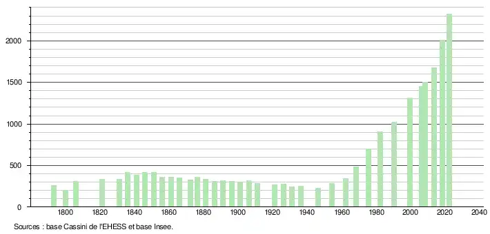 L'évolution du nombre d'habitants est connue à travers les recensements de la population effectués dans la commune depuis 1793. Pour les communes de moins de 10 000 habitants, une enquête de recensement portant sur toute la population est réalisée tous les cinq ans, les populations de référence des années intermédiaires étant quant à elles estimées par interpolation ou extrapolation[33]. Pour la commune, le premier recensement exhaustif entrant dans le cadre du nouveau dispositif a été réalisé en 2008[34].
