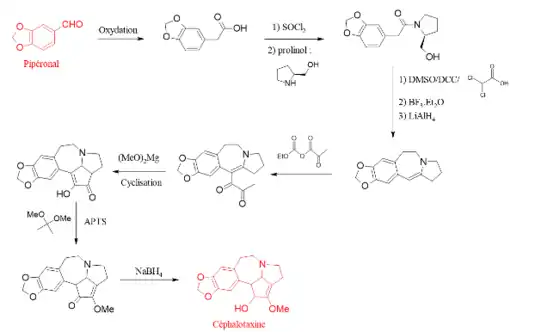 La synthèse de Weinreb permet de synthétiser la céphalotaxine bien que le rendement global soit relativement faible, atteignant seulement 2,7%[8]. C'est une voie de synthèse en 13 étapes dont le réactif de départ est le pipéronal, sur lequel est additionnée un prolinol (en) qui permet ensuite d'ajouter 2 nouveaux cycles dans la molécule. Un cycle supplémentaire est encore ajouté grâce à une dicétone qui est ensuite réduite à l'aide de NaBH4 pour obtenir la céphalotaxine.