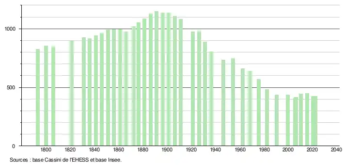 L'évolution du nombre d'habitants est connue à travers les recensements de la population effectués dans la commune depuis 1793. Pour les communes de moins de 10 000 habitants, une enquête de recensement portant sur toute la population est réalisée tous les cinq ans, les populations de référence des années intermédiaires étant quant à elles estimées par interpolation ou extrapolation[34]. Pour la commune, le premier recensement exhaustif entrant dans le cadre du nouveau dispositif a été réalisé en 2005[35].