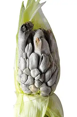 Le charbon du maïs, qui infecte le maïs cultivé, se développe dans les épis, dont il transforme les grains en une poudre noire de tissus fongiques. Au Mexique, où ils sont historiquement appréciés depuis les Aztèques, ces épis charbonneux, appelés huitlacoche, sont considérés comme un mets délicat.