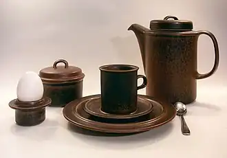- Des services de grande série, dessinés spécialement pour la reproduction industrielle. Des séries en porcelaine comme le "Form 25 thermo" de Erik Magnussen pour Bing et Grøndahl en 1965 innovent en dotant la théière et les tasses d'une double enveloppe destinée à manipuler sans difficulté un contenu brûlant.