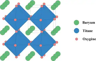 La structure la plus commune des oxydes technologiques à propriétés piézoélectriques est un réseau cristallin orthorhombique formé par des octaèdres d'anions à l'intérieur desquels est emprisonné un cation relativement petit ; huit de ces octaèdres forment un cube possédant une lacune au centre de laquelle est emprisonné un autre cation relativement grand. Ce type de structure est appelé pérovskite. Un exemple en est le titanate de baryum BaTiO3, dont la structure cristalline est illustrée ci-contre. Dans cette illustration d'une pérovskite à haute température, la taille des ions n'est pas respectées afin de pourvoir visualiser clairement le polyèdre de coordination du titane. Le rayon de l'anion oxygène O2− est en réalité le plus grand.