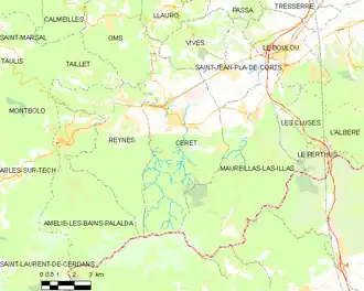Céret se situe à l'entrée du Vallespir et de la haute-vallée du Tech. La ville est traversée par la route départementale 115, ancienne route nationale 115, qui relie Le Boulou à l'Espagne par le col d'Ares en suivant le cours du Tech jusqu'à Prats-de-Mollo. Depuis juin 2010 et la mise en service de la déviation ouest du Boulou sur la route départementale 900 (ancienne route nationale 9), elle complète l'accès routier à Céret depuis la plaine roussillonnaise et notamment depuis Perpignan. Le conseil général a pour projet de relier cette déviation à Céret par une route à une fois deux voies, déviant ainsi Saint-Jean-Pla-de-Corts[26] et aboutissant sur la route départementale 618, après le franchissement du Tech par un nouveau pont routier prévu vers 2025.