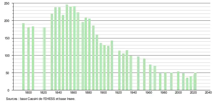 L'évolution du nombre d'habitants est connue à travers les recensements de la population effectués dans la commune depuis 1793. Pour les communes de moins de 10 000 habitants, une enquête de recensement portant sur toute la population est réalisée tous les cinq ans, les populations de référence des années intermédiaires étant quant à elles estimées par interpolation ou extrapolation[20]. Pour la commune, le premier recensement exhaustif entrant dans le cadre du nouveau dispositif a été réalisé en 2006[21].