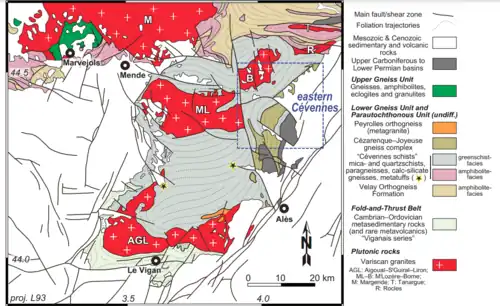 - ↑ (en) Simon Couzinié, Pierre Bouilhol, Oscar Laurent, Thomas Grocolas, Jean-Marc Montel, « Cambro–Ordovician ferrosilicic magmatism along the northern Gondwana margin: constraints from the Cézarenque–Joyeuse gneiss complex (French Massif Central) », Bulletin de la Société Géologique de France, vol. 193, no 1, , p. 19 (DOI 10.1051/bsgf/2022010, lire en ligne).