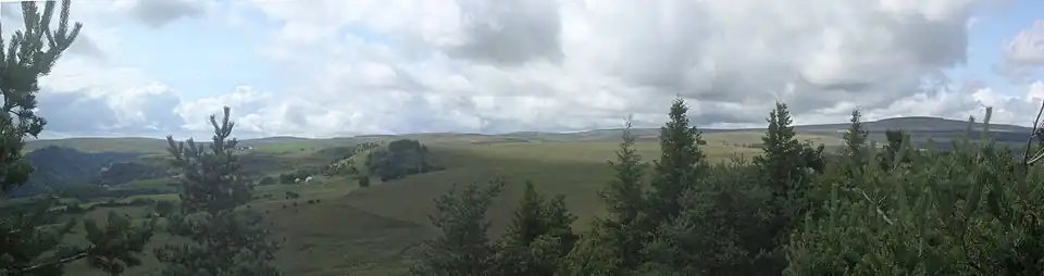 Le Cézallier forme un ensemble de plateaux et petites montagnes volcaniques, principalement constitués de coulées de lave fluide (basalte)[6] mais aussi de quelques cratères dont les plus récents ont seulement quelques milliers d'années (Montchal, Montcineyre) et sont parfois occupés par des lacs (Pavin, Chauvet, La Godivelle).