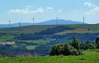 Les éoliennes du puy de Mathonière barrent le panorama sur les monts du Cantal.