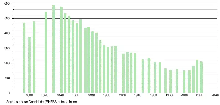 L'évolution du nombre d'habitants est connue à travers les recensements de la population effectués dans la commune depuis 1793. Pour les communes de moins de 10 000 habitants, une enquête de recensement portant sur toute la population est réalisée tous les cinq ans, les populations de référence des années intermédiaires étant quant à elles estimées par interpolation ou extrapolation[20]. Pour la commune, le premier recensement exhaustif entrant dans le cadre du nouveau dispositif a été réalisé en 2006[21].