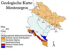 La côte monténégrine est principalement formée par les unités tectoniques de la zone de plissement adriatique-ionienne et de la zone Pinde-Cukali. Ce n'est qu'à l'intérieur de la baie de Kotor que la couverture karstique de l'orogène dinarique atteint directement la mer.