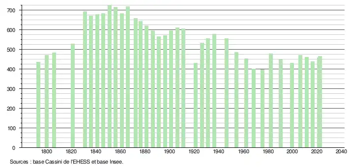 L'évolution du nombre d'habitants est connue à travers les recensements de la population effectués dans la commune depuis 1793. Pour les communes de moins de 10 000 habitants, une enquête de recensement portant sur toute la population est réalisée tous les cinq ans, les populations de référence des années intermédiaires étant quant à elles estimées par interpolation ou extrapolation[28]. Pour la commune, le premier recensement exhaustif entrant dans le cadre du nouveau dispositif a été réalisé en 2006[29].