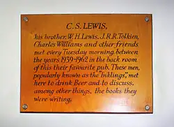 Ami intime de J. R. R. Tolkien (auteur du Hobbit et du Seigneur des Anneaux, pour lesquels Lewis écrit d'élogieuses critiques sous couvert d'anonymat), ils fréquentent ensemble un cercle littéraire qui s'appelait les « Inklings », où l'on retrouve également Owen Barfield. On y lit pour la première fois les romans de Lewis, Tolkien et de Charles Williams. Généralement, ils se rencontraient au pub The Eagle and Child à Oxford, et les discussions avaient lieu autour d'une bière.