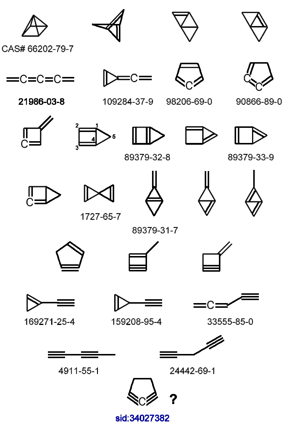 - Un composé avec un carbone hexavalent (!?), le 1,2-cyclopentadiyne est présent sur ChemSpider et est référencé sur PubChem : SID 34027382