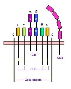 La région transmembranaire des chaînes CD3 est chargée négativement, caractéristique qui leur permet de s'associer avec les chaînes du TCR (TCRα et TCRβ), chargées positivement[2]. La partie intracellulaire des molécules CD3 contient un motif fortement conservé connu sous le nom d'ITAM (immunoreceptor tyrosine-based activation motif). Ce motif est essentiel pour la signalisation du TCR. La phosphorylation du motif ITAM sur les chaînes CD3 leur permet de lier une enzyme appelée ZAP70 (zeta associated protein), kinase importante pour la cascade de signalisation des cellules T. Par ailleurs CD4 est le co-récepteur du complexe TCR-CD3.