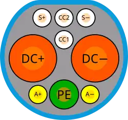 La configuration EE est destinée à être utilisée avec des bornes de recharge CC qui implémentent le système C selon la norme CEI 61851-23 et le protocole de communication API selon la norme IEC 61851-24 Annexe C et ISO 15118-3. Cette configuration est surtout utilisé aux États-Unis, où elle est reprise par la norme SAE J1772.