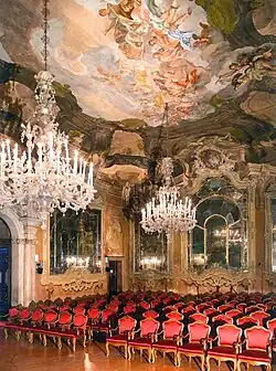 Le grand salon avec la voûte décorée de fresques par Nicolò Bambini et Antonio Felice Ferrari et où se trouvait autrefois la série d'histoires romaines peintes sur toile par Tiepolo reste d'une grande valeur. Dans les vides laissés à l'intérieur des cadres décorés de fresques en faux stuc qui abritaient les toiles, Brusa, après l'achat du bâtiment en 1876, a adapté des miroirs d'aspect antique.
