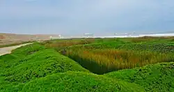 Depuis la plage, au loin vers la terre on aperçoit une ligne verte presque imperceptible. L'endroit est nommé Los Humedales de Huanchaco.