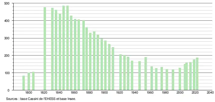 L'évolution du nombre d'habitants est connue à travers les recensements de la population effectués dans la commune depuis 1793. Pour les communes de moins de 10 000 habitants, une enquête de recensement portant sur toute la population est réalisée tous les cinq ans, les populations de référence des années intermédiaires étant quant à elles estimées par interpolation ou extrapolation[29]. Pour la commune, le premier recensement exhaustif entrant dans le cadre du nouveau dispositif a été réalisé en 2008[30].