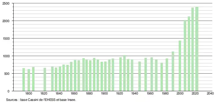 | L'évolution du nombre d'habitants est connue à travers les recensements de la population effectués dans la commune depuis 1793. Pour les communes de moins de 10 000 habitants, une enquête de recensement portant sur toute la population est réalisée tous les cinq ans, les populations de référence des années intermédiaires étant quant à elles estimées par interpolation ou extrapolation[33]. Pour la commune, le premier recensement exhaustif entrant dans le cadre du nouveau dispositif a été réalisé en 2006[34]. En 2022, la commune comptait 2 400 habitants[Note 7], en évolution de +1,05 % par rapport à 2016 (Gironde : +6,91 %, France hors Mayotte : +2,11 %). |
