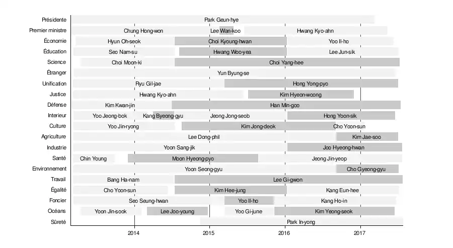 | Presidente | Park Geun-hye | 25 février 2013 | 10 mars 2017 [note 1]. | ||